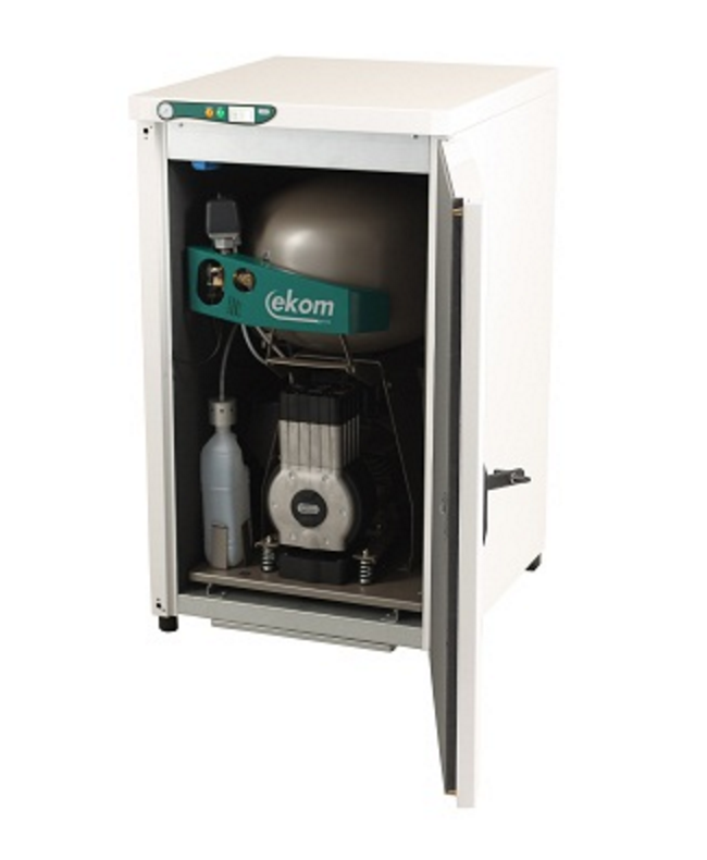 Безмаслянный компрессор EKOM с отсасывающим агрегатом серии DUO 2V являются источниками чистого сжатого воздуха, несодержащего масляных капельных включений, который предназначен для приведения в действие зубоврачебных приборов и устройств, а также для создания пониженного давления в отсасывающем агрегате. Благодаря своим параметрам и размерам резервуара воздуха объемом 25 л и наличию отсасывающего агрегата, компрессор этого типа может обслуживать один или два стоматологических установок, которые оборудованы вытяжным блоком. Сжатый воздух, производимый безмасляным компрессором указанного типа, обеспечивает высокую степень соблюдения гигиены и качества труда стоматолога, не создавая, притом, вокруг себя среду, содержащую чужеродные вещества. По своему дизайну компрессор этого типа являются очень удобным для применения непосредственно в зубоврачебном кабинете, органично вписываясь в их интерьер.