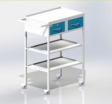 Столик передвижной на колесных опорах диаметром  50 мм (2 опоры с тормозом),  2 ящика (один ящик оснащен замком), 2 полки, столешница  из нержавеющей стали.