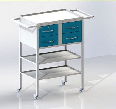 Столик передвижной на колесных опорах диаметром 50 мм, 4 ящика (один ящик оснащается замком), две полки, столешница из нержавеющей стали (с дополнительной выдвижной полкой)
